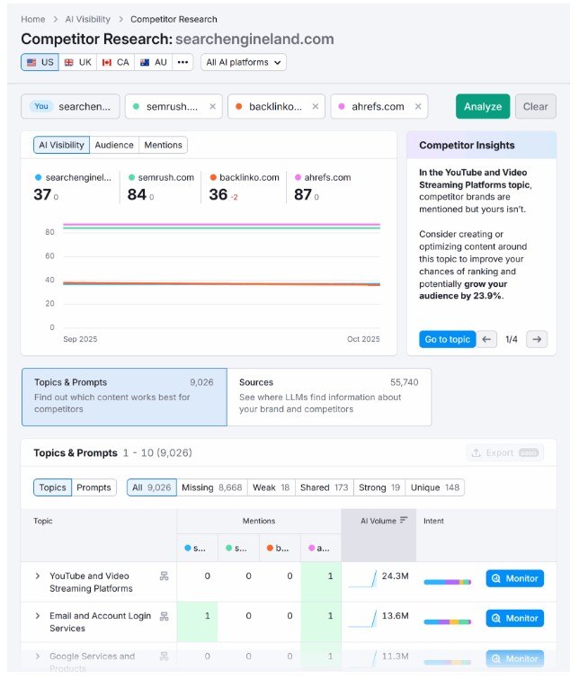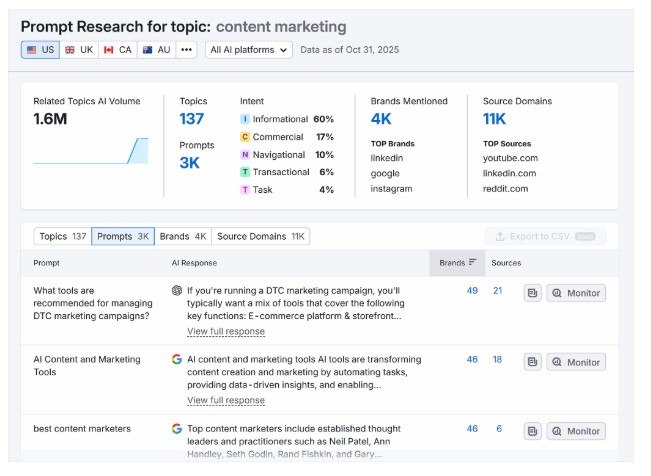 Semrush主題研究按主題聚集的想法、子主題和搜尋引擎中的熱門搜尋字詞。內容缺口、基於問題的標題和經常被問到的子主題,例如「2025 年 AI 可見性指標」和「衡量 LLM 引用」。這突顯了新興主題;非常適合撰寫新文章或擴展核心內容。