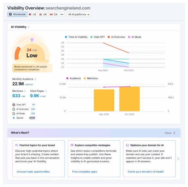 Semrush 的 AI SEO 工具包等工具可以簡化這個過程。該工具包可追蹤: